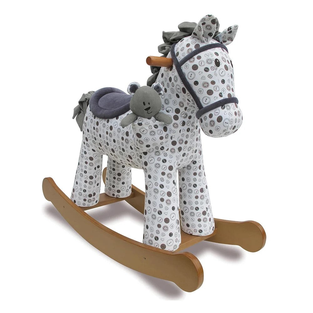 Dylan & Boo är en fantastisk duo som ditt barn kommer att älska. Dylan är en gunghäst i texturerat vävt tyg, med läderliknande träns och sadel samt stadiga trämedar. Boo är en avtagbar, bönfylld mini-björn som barnet kan ta med sig överallt – en vän både på och av hästryggen!