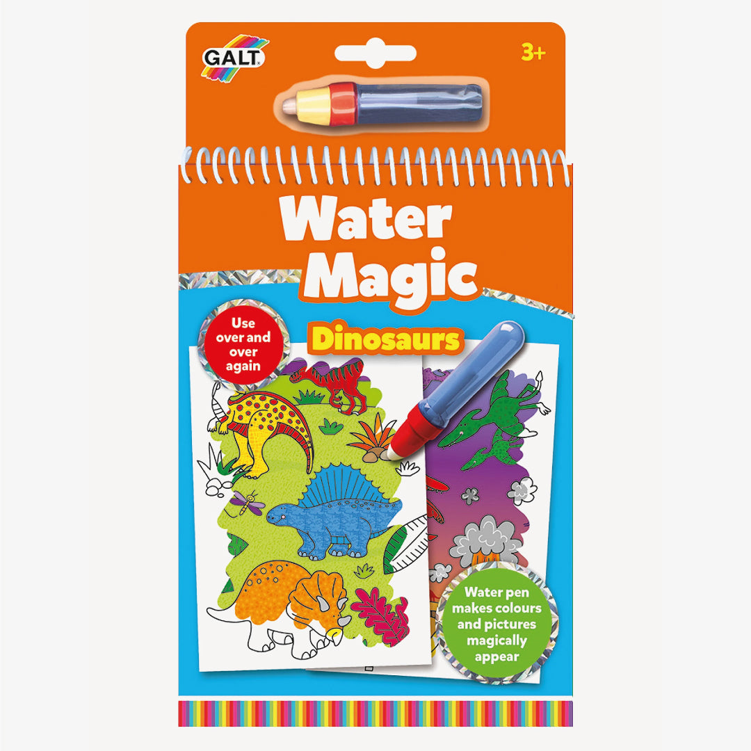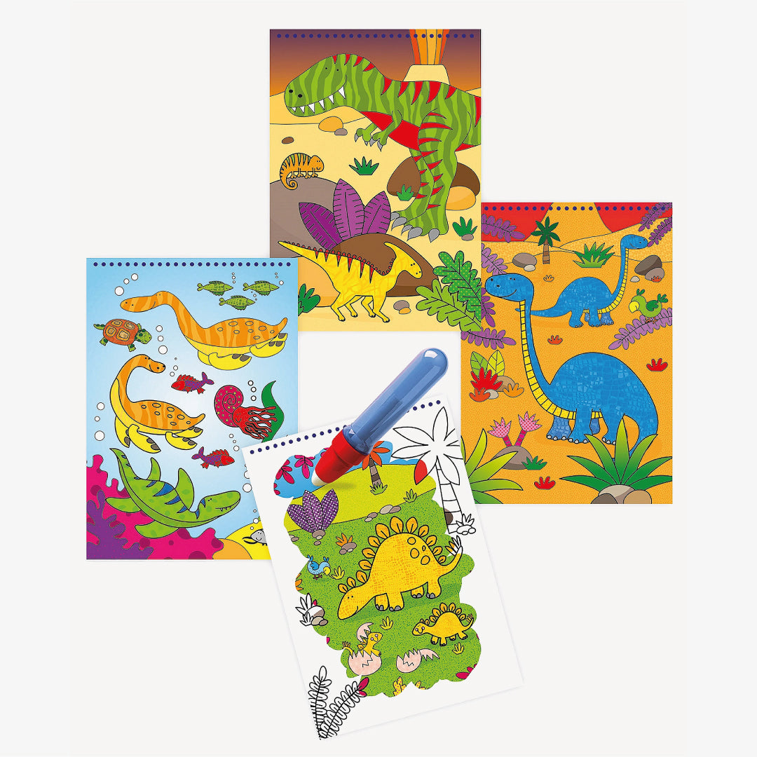 Fyll pennan med vatten och måla på någon av de 6 bilderna – plötsligt dyker dinosaurierna upp som genom trolleri! När vattnet torkar blir allt vitt igen, redo att målas om och om igen. Perfekt för små paleontologer på språng!