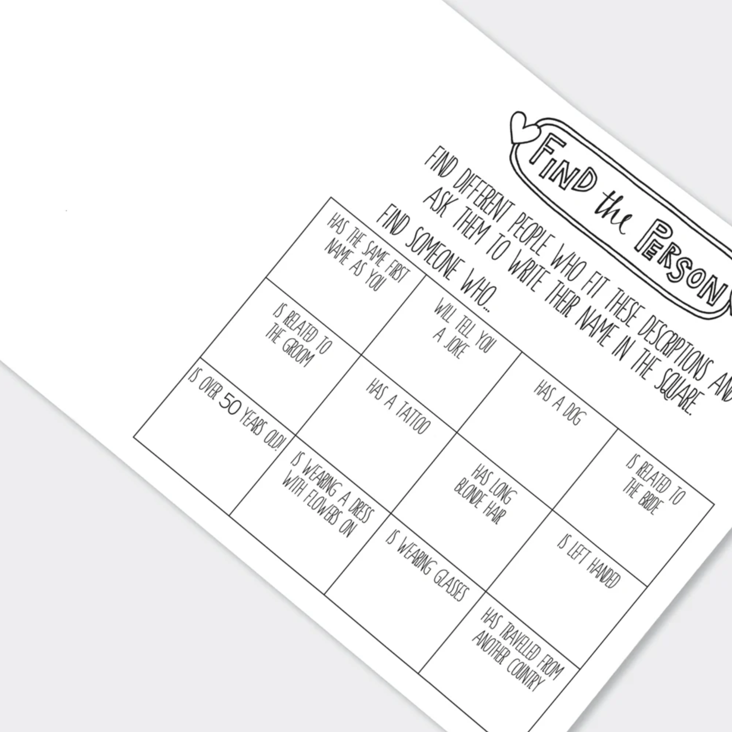 Underhåll barnen under bröllopet med 12 sidor pyssel, färgläggning och kul – perfekt för små händer! Denna söta aktivitetsbok håller de yngsta sysselsatta under ceremonin, middagen eller talen och ger en rolig paus mitt i festligheterna.